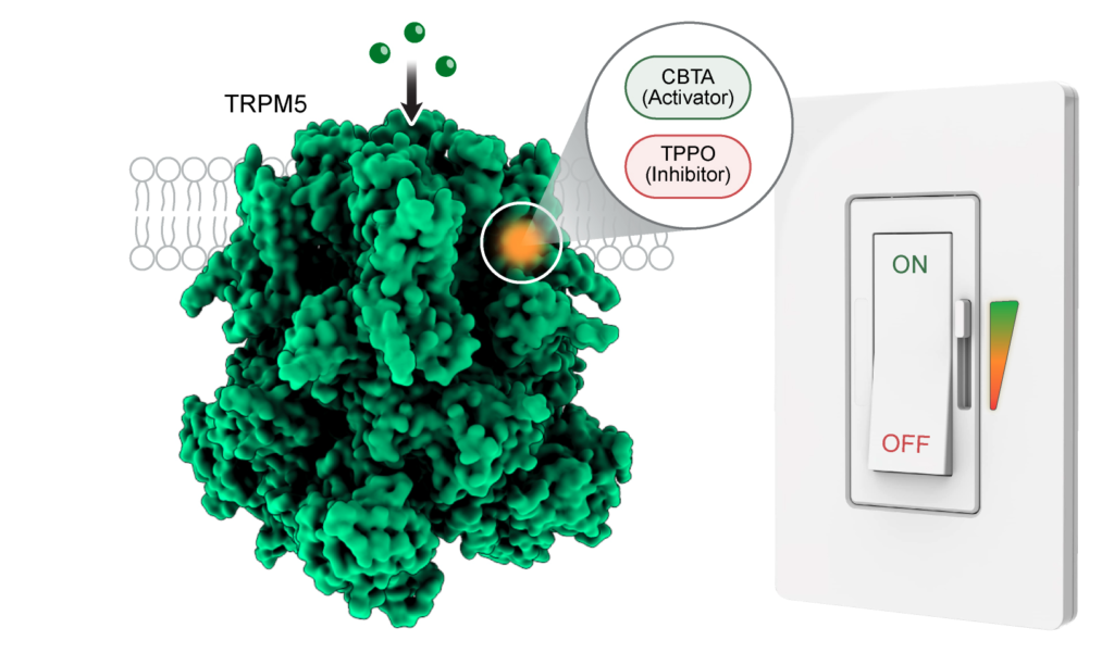 The cryo-EM density maps of CBTA/EDTA–TRPM5(consensus), CBTA/EDTA–TRPM5(open), CBTA/Ca2+–TRPM5, 200 μM Ca2+–TRPM5, 1 μM Ca2+–TRPM5, 2 μM Ca2+–TRPM5, CBTA/EGTA–TRPM5, Ca2+–TRPM5-D797A, CBTA/Ca2+–TRPM5(D797A), CBTA/Ca2+–TRPM5-D797N, TPPO/Ca2+–TRPM5, CBTA/Ca2+–TRPM5-E337A, CBTA/Ca2+–TRPM5-Q771A and Ca2+–TRPM5-Q771A were deposited to the EM Data Bank under accession numbers EMD-71244, EMD-71245, EMD-71246, EMD-71247, EMD-71248, EMD-71249, EMD-71250, EMD-71251, EMD-71252, EMD-71253, EMD-71254, EMD-71255, EMD-71256 and EMD-71257, respectively.