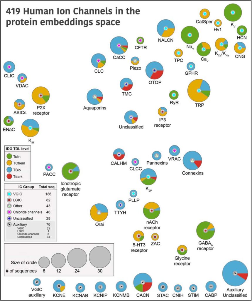 The ion channel (IC) genes encoded in the human genome play fundamental roles in cellular functions and disease and are one of the largest classes of druggable proteins. However, limited knowledge of the diverse molecular and cellular functions carried out by ICs presents a major bottleneck in developing selective chemical probes for modulating their functions in disease states. The wealth of sequence data available on ICs from diverse organisms provides a valuable source of untapped information for illuminating the unique modes of channel regulation and functional specialization. However, the extensive diversification of IC sequences and the lack of a unified resource present a challenge in effectively using existing data for IC research. Here, we perform integrative mining of available sequence, structure, and functional data on 419 human ICs across disparate sources, including extensive literature mining by leveraging advances in large language models to annotate and curate the full complement of the “channelome”. We employ a well-established orthology inference approach to identify and extend the IC orthologs across diverse organisms to above 48,000. We show that the depth of conservation and taxonomic representation of IC sequences can further be translated to functional similarities by clustering them into functionally relevant groups, which can be used for downstream functional prediction on understudied members. We demonstrate this by delineating co-conserved patterns characteristic of the understudied family of the Calcium Homeostasis Modulator (CALHM) family of ICs. Through mutational analysis of co-conserved residues altered in human diseases and electrophysiological studies, we show that these evolutionarily-constrained residues play an important role in channel gating functions. Thus, by providing new tools and resources for performing large comparative analyses on ICs, this study addresses the unique needs of the IC community and provides the groundwork for accelerating the functional characterization of dark channels for therapeutic intervention.